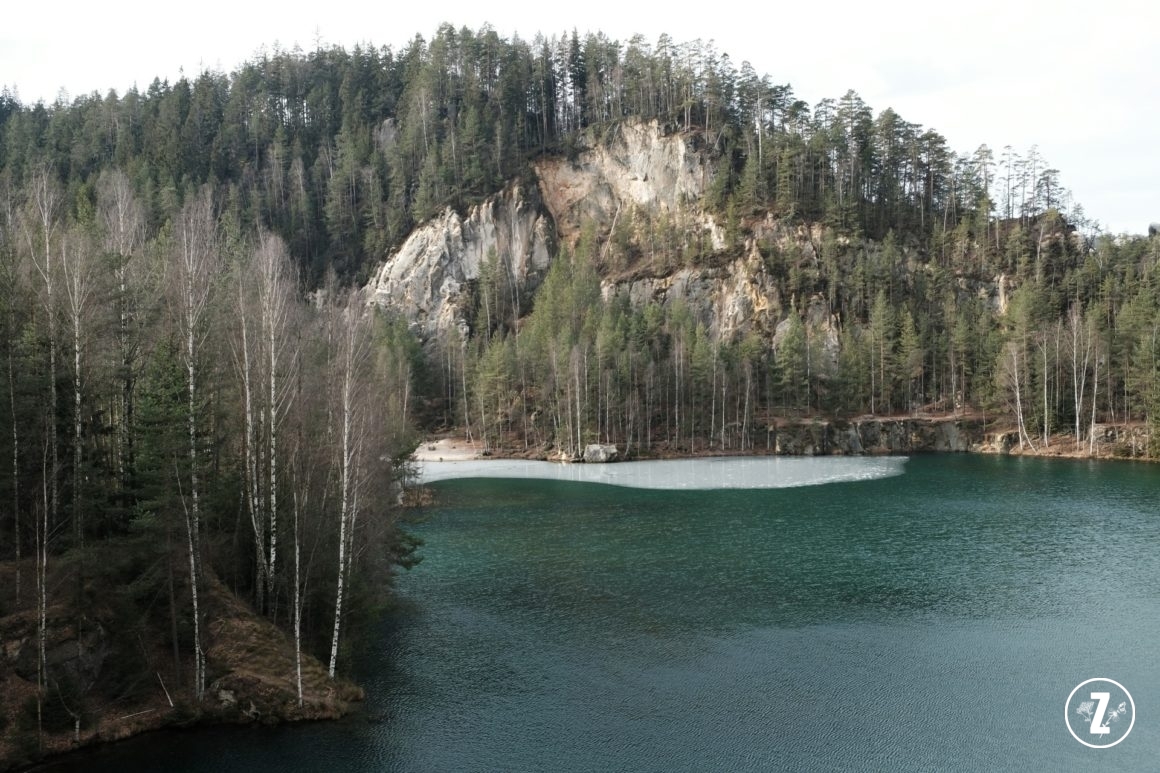 Trasę zaczęliśmy od przejścia niebieskim szlakiem zaraz za kasą biletową przy Centrum Informacyjnym wkoło jeziora, a dokładniej zalanego kamieniołomu. Trasa ta liczy około 1,5 km, podczas których można robić przerwy na napawanie się pięknym widokiem.