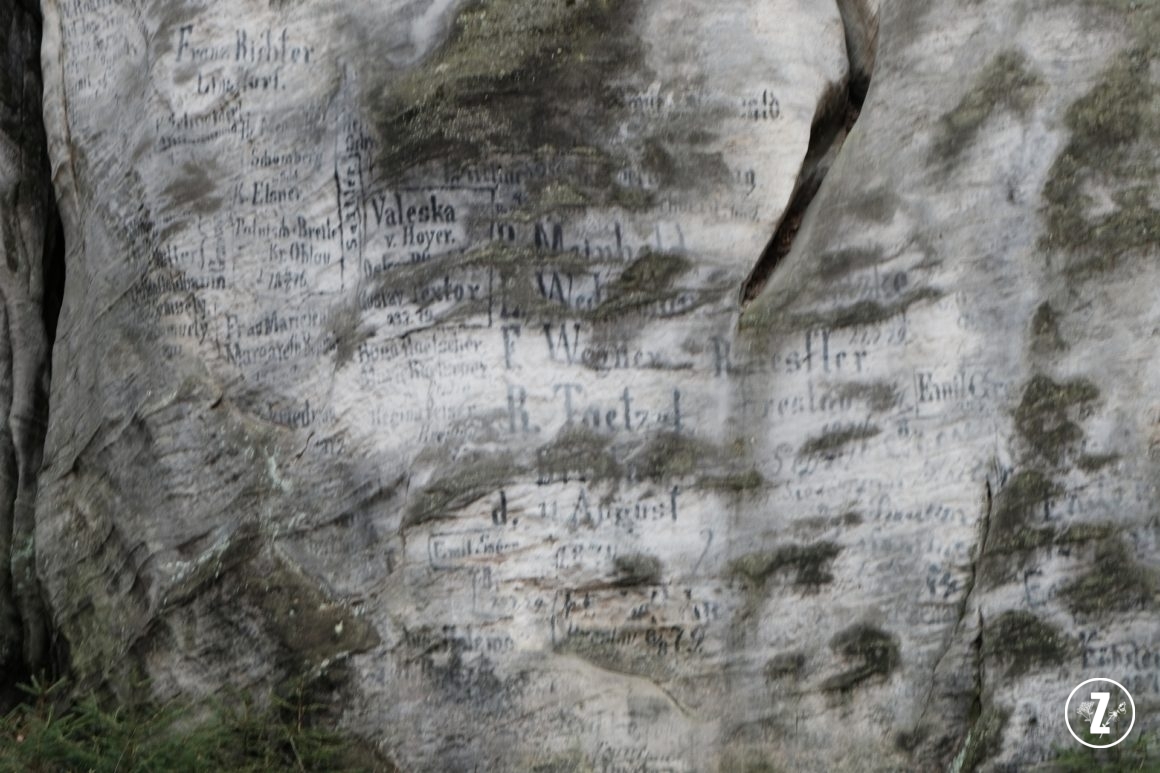 Spacerując szlakiem można w kilku miejscach zauważyć napisy na skałach, pozostawione po dawnych wycieczkach. Wiele inskrypcji jest w języku polskim, co może świadczyć o dużej popularności tego miejsca wśród rodaków. Nie popieram takich występków i niszczenia skał bazgrołami, ale w tym wypadku jest to ciekawa pamiątka.