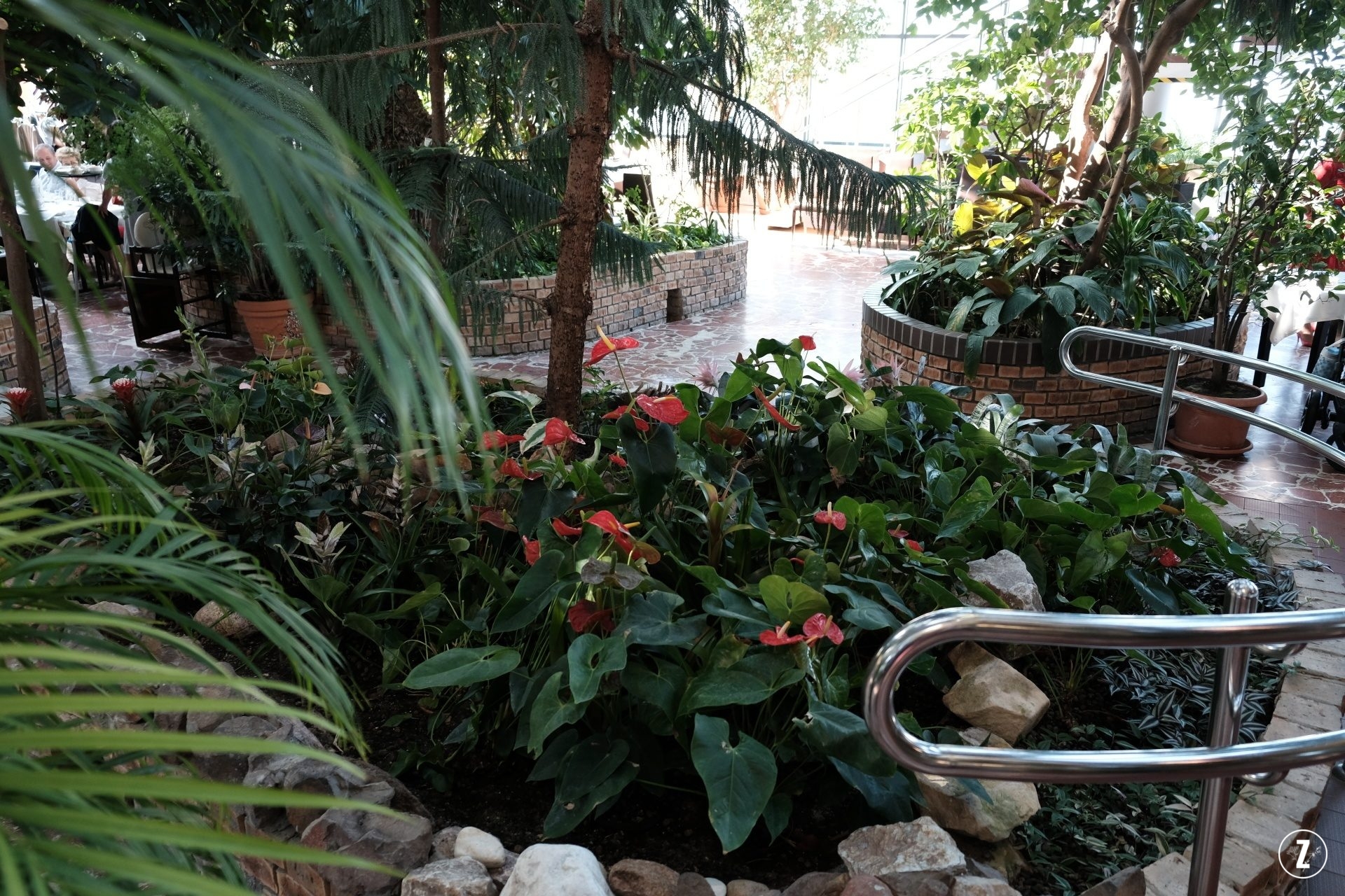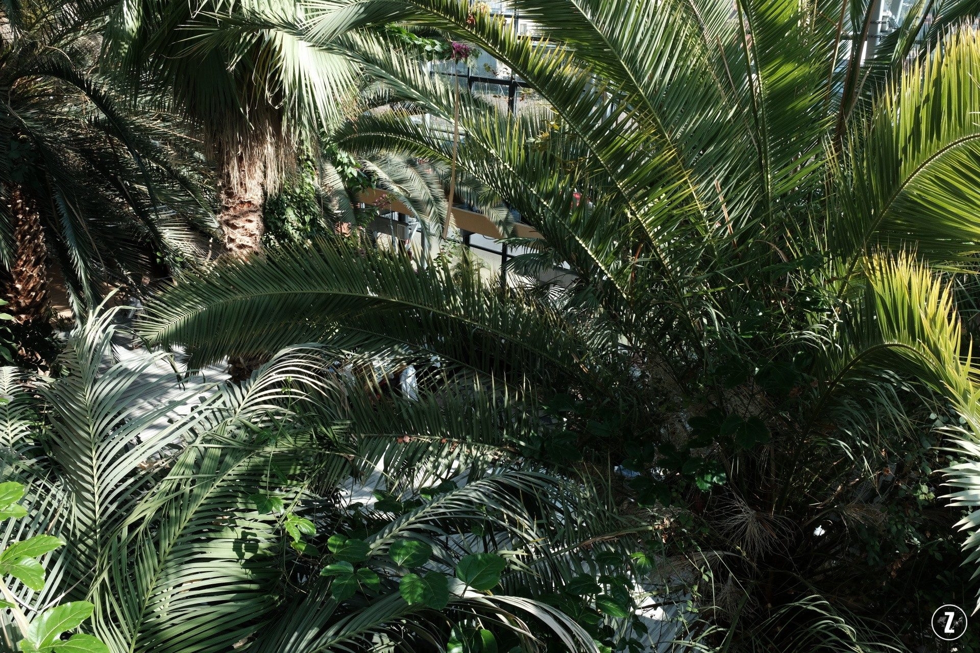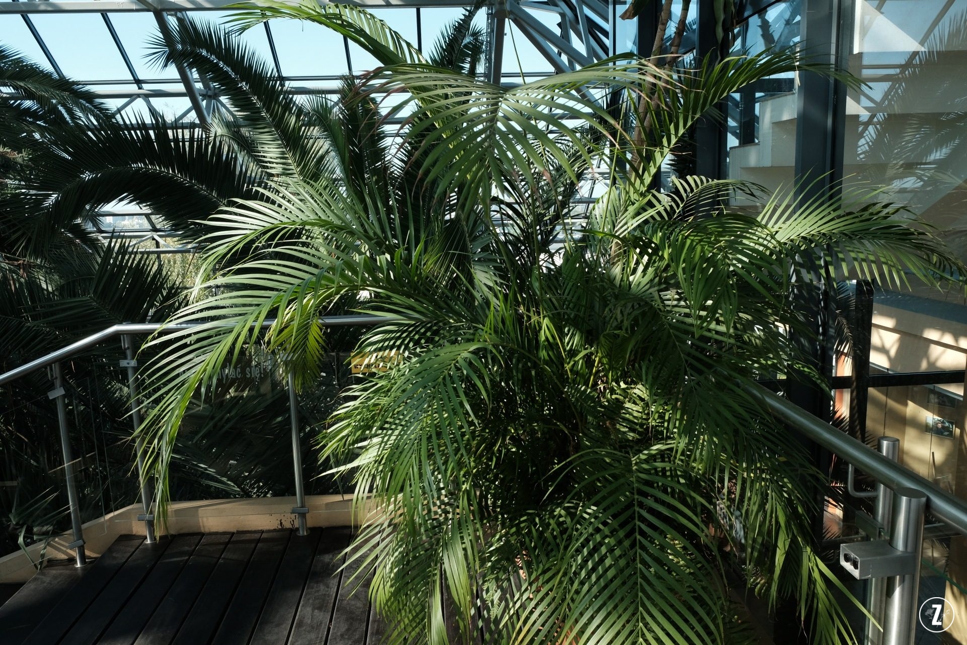 W Palmiarni Zielonogórskiej znajdziemy około 150 gatunków roślin zarówno ze strefy równikowej jak i zwrotnikowej (dla porównania w palmiarni w Wałbrzychu jest ich 250, a w Poznaniu możemy ich zobaczyć aż ponad 1100). Jednak, aby móc spokojnie obejrzeć te rośliny, trzeba wjechać windą lub wejść schodami na wyższe kondygnacje, ponieważ na parterze, pośród donic i zieleńców znajduje się… restauracja, w niedzielne popołudnie tłoczna od rodzin organizujących wśród niecodziennej, zielonej scenerii okolicznościowe obiady. Spacer pośród gęsto rozstawionych stolików to tak naprawdę slalom pomiędzy masą cioć, wujków i chrzestnych, niekomfortowy zarówno dla mnie, jak i dla nich. Cóż, do tej palmiarni lepiej nie przychodzić w niedzielne popołudnie. A jeśli już, to widoki należy podziwiać z góry.